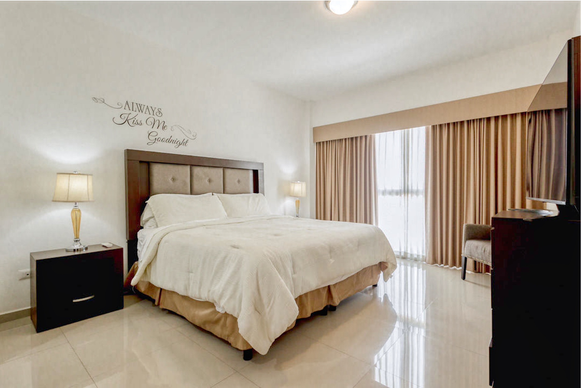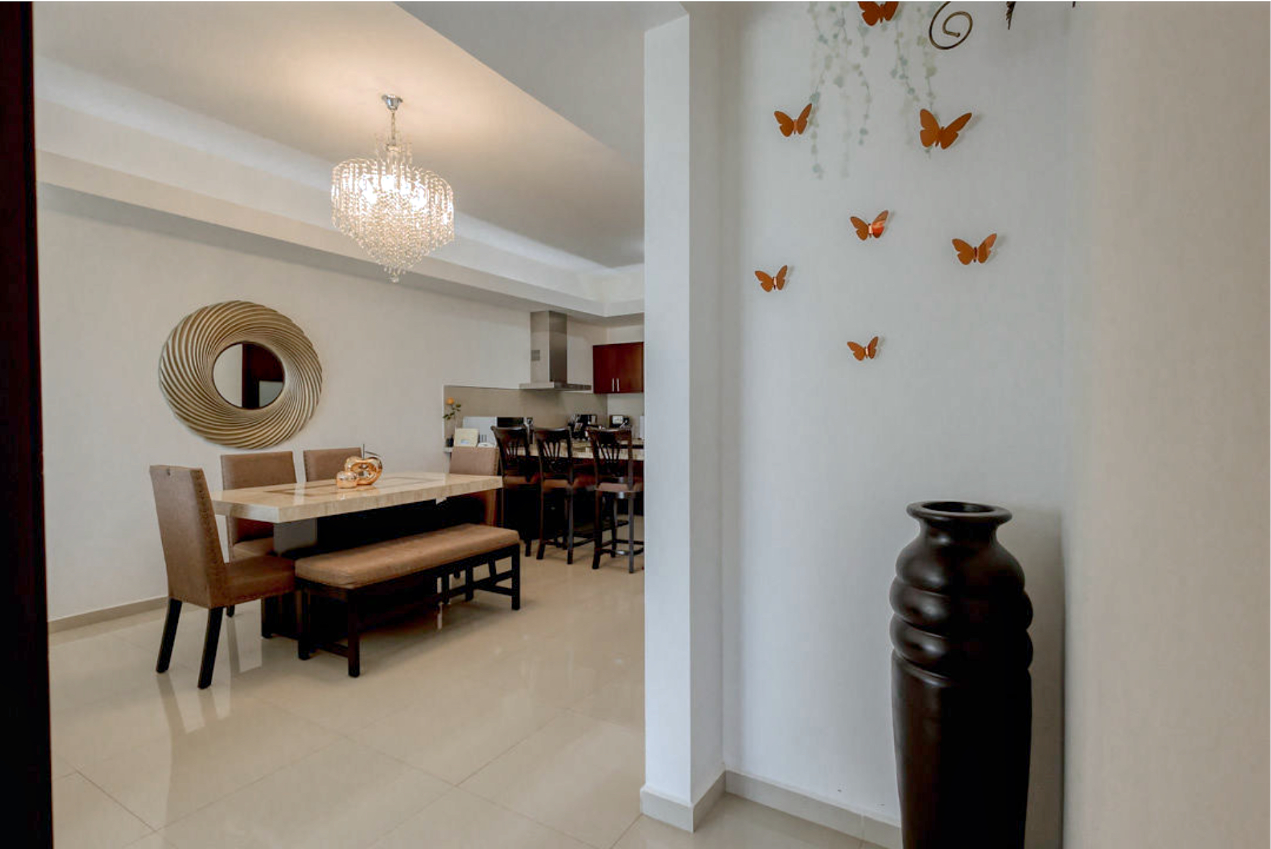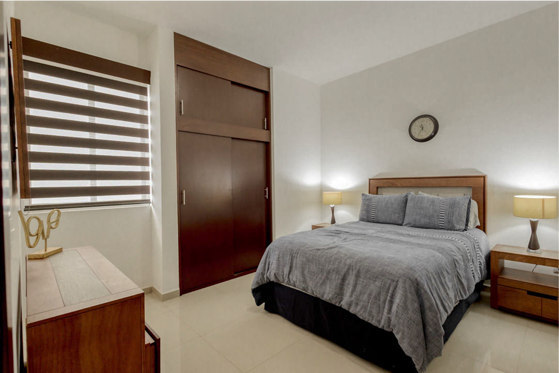 Consta de 2 reconfortantes habitaciones, la principal con vestidor y baño completo, una habitacion secundaria con closet y comparte baño completo con el aera social del departament, una acojedora sala, comer y cocina completamente equipada y un cuarto de lavado.
