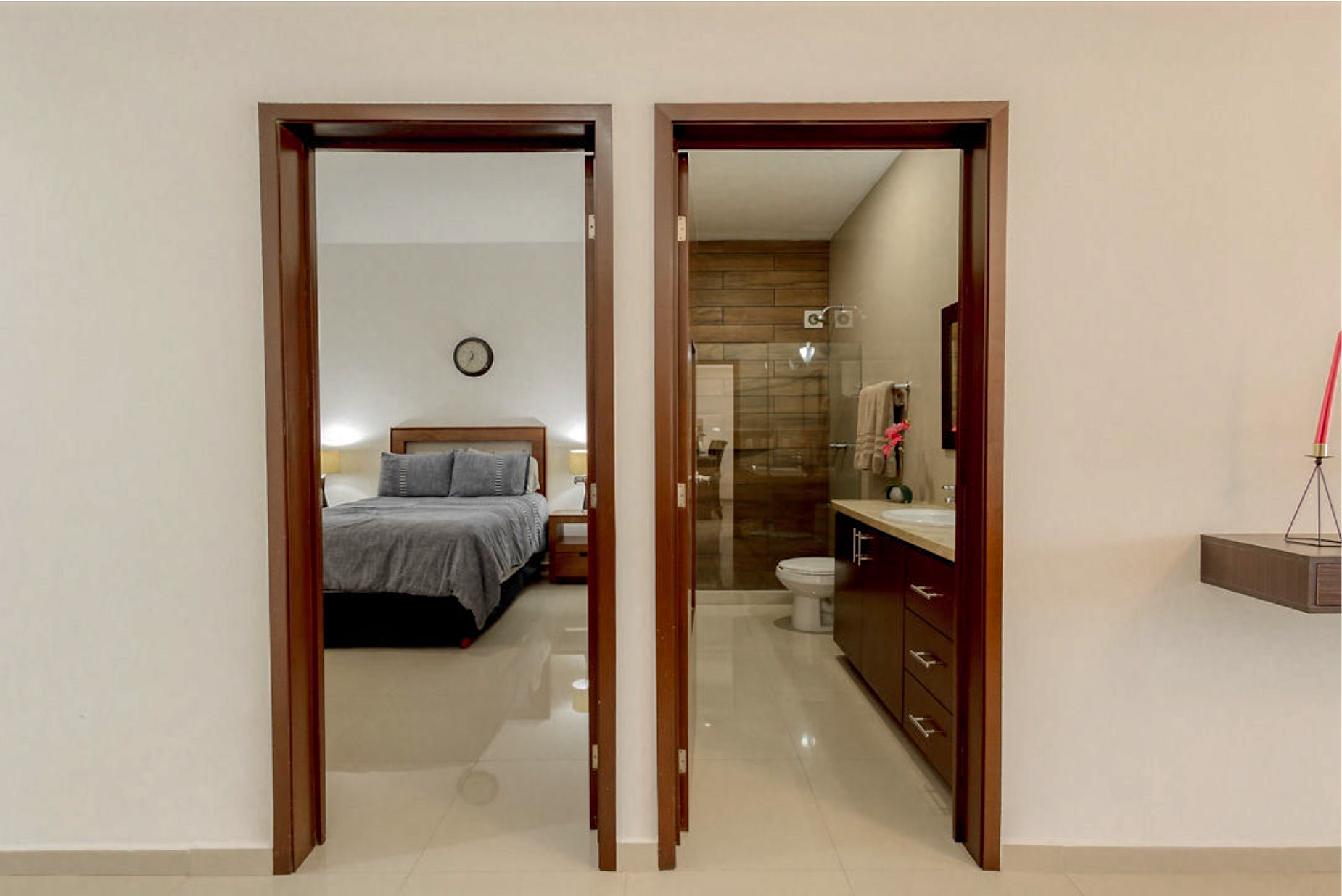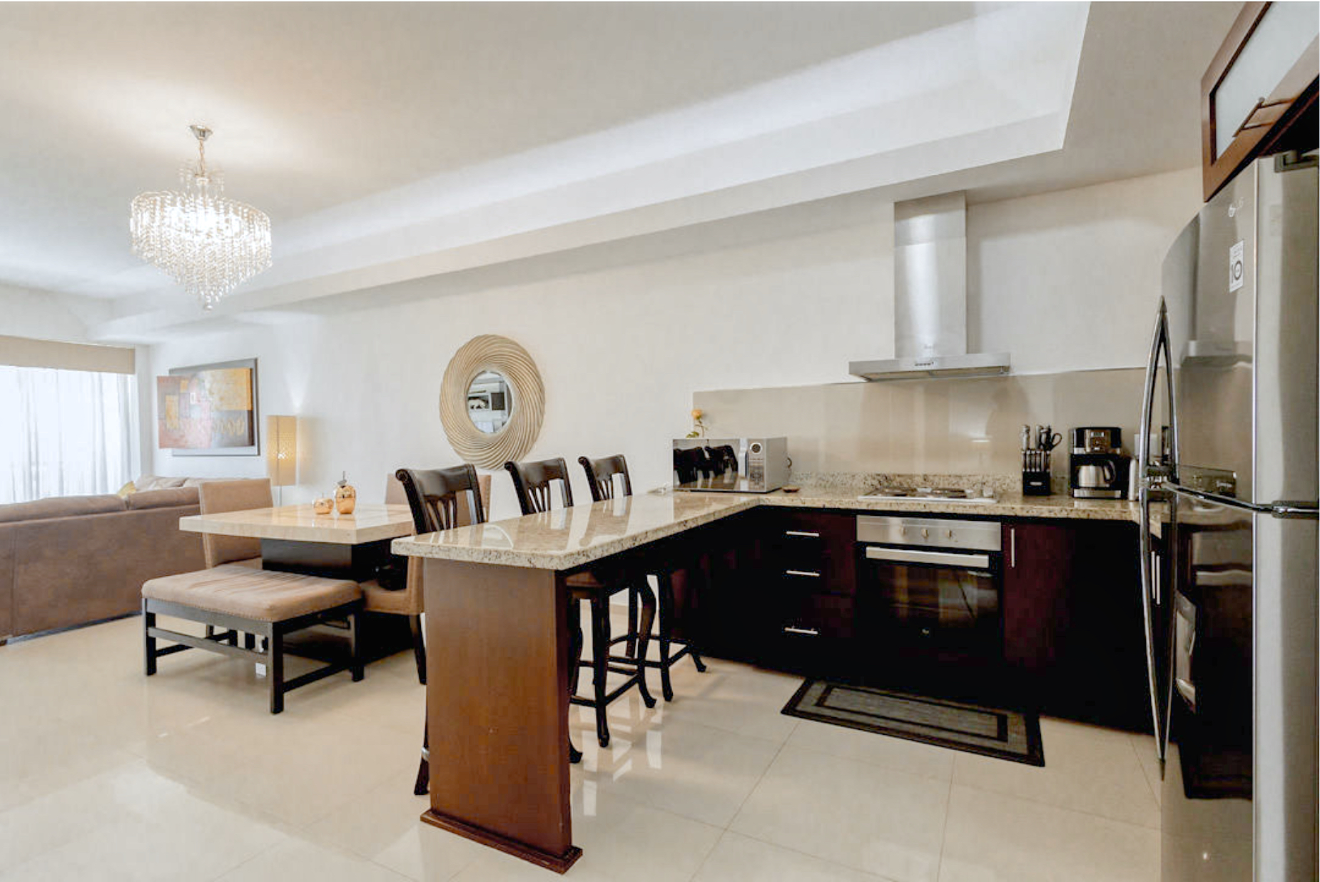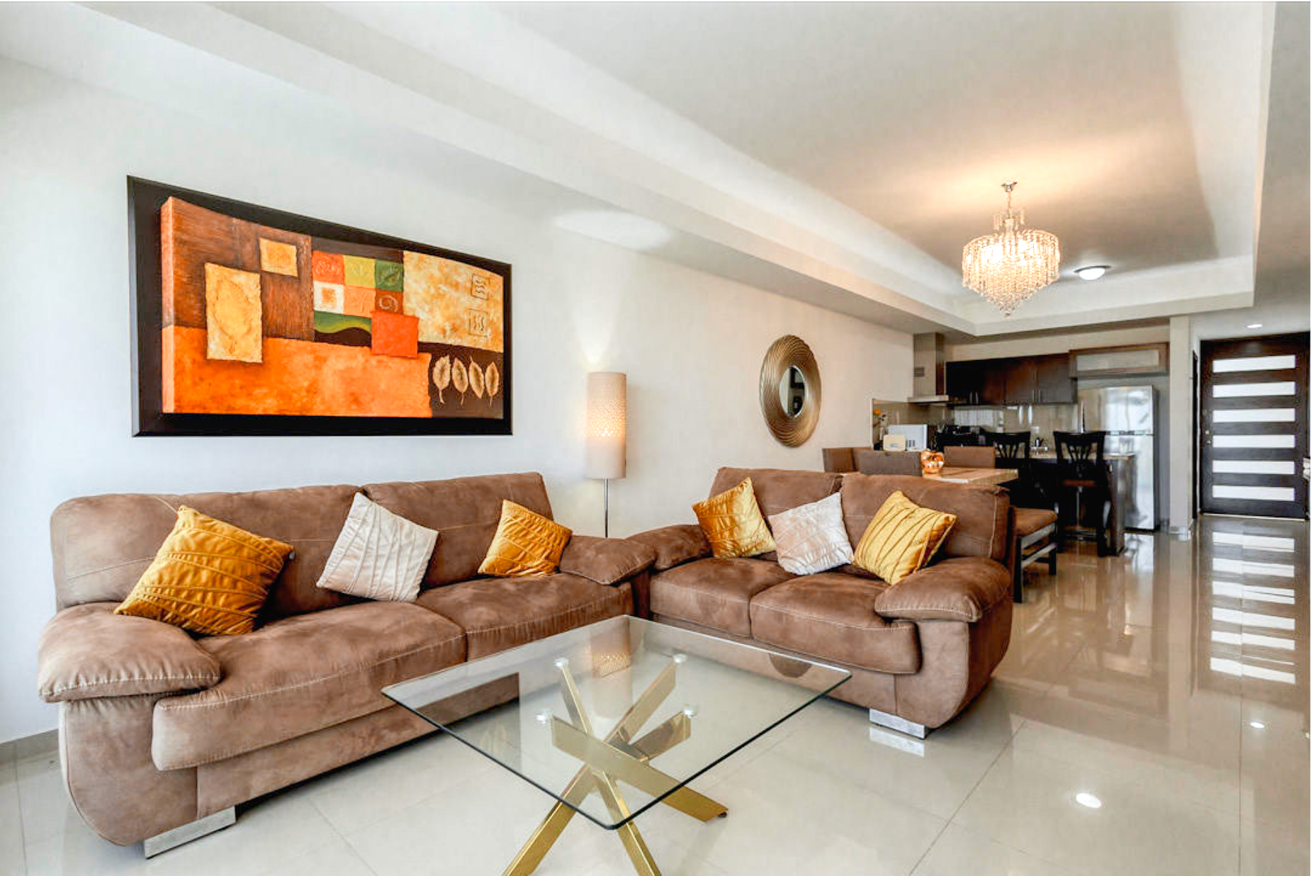 Consta de 2 reconfortantes habitaciones, la principal con vestidor y baño completo, una habitacion secundaria con closet y comparte baño completo con el aera social del departament, una acojedora sala, comer y cocina completamente equipada y un cuarto de lavado.